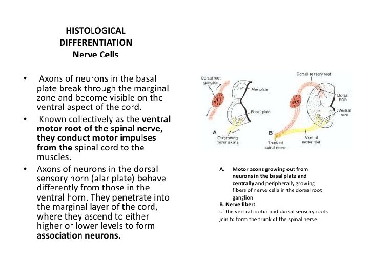 Spinal Cord Development A. Marginal Zone 1. Derivative of neural tube 2. White matter portion of central nervous system B. Alar plate 1. Derivative of neural tube 2. Portion of central nervous system 3. Associated with afferent (sensory) function C. Basal plate 1. Derivative of neural tube 2. Portion of central nervous system 3. Associated with efferent (motor) function D. Sulcus limitans (between B and C) 1. Derivative of neural tube 2. Portion of central nervous system 3. Separates alar plate from basal plate Intermediate zone