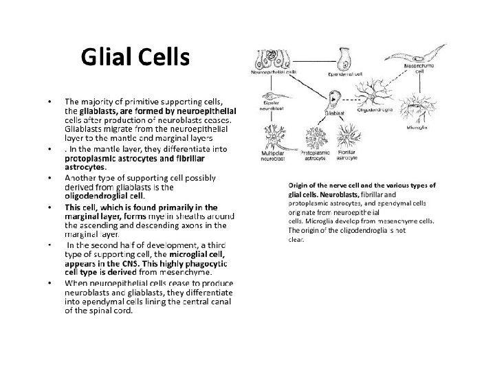 Development of Spinal Cord Gliogenesis Glioblasts migrate from the neuroepithelial layer to the mantle and marginal layers In the mantle layer they differentiate into protoplasmic and fibrillar astrocytes In the marginal layer oligodendroglial cells differentiate. This cell forms myelin sheaths around the ascending and descending axons Later a third type of supporting cell, the microglial cell, appears in the CNS. This highly phagocytic cell type is derived from vascular mesenchyme when blood vessels grow into the nervous system