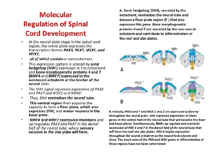 Molecular Events Dorsal and ventral regions of the developing spinal cord are dependent upon concentration gradients between members of the transforming growth factor beta (TGF-b) family of growth factors secreted in the dorsal neural tube and sonic hedgehog (SHH) secreted by the notochord and floor plate. Initially BMP 4 and 7 are secreted by ectoderm overlying the neural tube, then, BMP 4 induces a cascade of TGF-b proteins, including BMP 5, BMP 7, activin, and dorsalin in the roof plate and surrounding area. As a result, cells near the roof plate are exposed to the highest concentrations with more ventrally positioned cells seeing less and less of these factors. Similar events occur in the ventral region of the neural tube, only the signaling molecule is SHH. This factor is first expressed in the notochord followed by the establishment of a second signaling center in the floor plate. As a result, there is a diminishing concentration of SHH from the ventral to the dorsal region of the neural tube. These gradients then activate transcription factors that regulate differentiation of sensory and motor neurons.