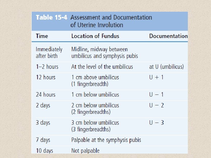 FUNDUS: The uterine fundus can be palpated midline, midway between the umbilicus and symphysis pubis. Within an hour, the uterus settles in the midline at the level of the umbilicus. Over the course of days, the uterus descends into the pelvis at a rate of about 1 cm/day (one fingerbreadth) (Fig below). After 10 days, the uterus has descended into the pelvis and is no longer palpable. The fundus is assessed for consistency (firm, soft, or boggy), location (should be midline), and height (measured in finger breadths).
