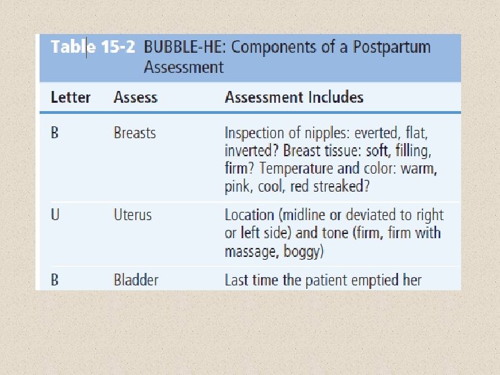 Postpartum Assessment Guide to Facilitate Nursing Care THE BUBBLE-HE MNEMONIC To assist with the postpartum assessment, the mnemonic BUBBLE -HE is commonly used to guide nursing practice. BUBBLE-HE reminds the nurse to assess the breasts, uterus, bladder, bowel, lochia, and episiotomy. Assessment of maternal pain, Homans’ sign, the patient’s emotional status and initiation of infant bonding are other important components to be included in the postpartum evaluation (Table below).