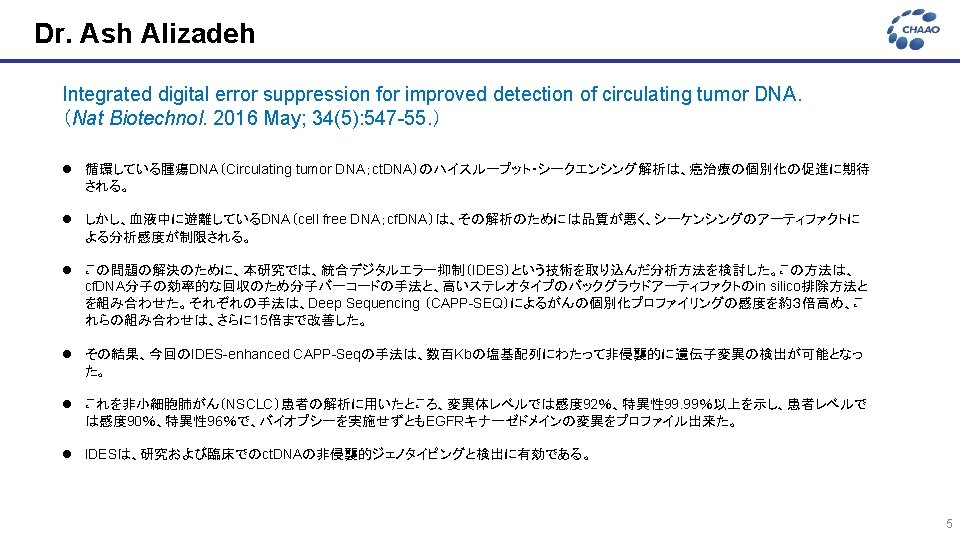 Dr. Ash Alizadeh Newman AM, Lovejoy AF, Klass DM, Kurtz DM, Chabon JJ, Scherer F, Stehr H, Liu CL, Bratman SV, Say C, Zhou L, Carter JN, West RB, Sledge GW Jr, Shrager JB, Loo BW Jr, Neal JW, Wakelee HA, Diehn M, Alizadeh AA. Integrated digital error suppression for improved detection of circulating tumor DNA. Nat Biotechnol. 2016 May; 34(5): 547 -55. Chaudhuri AA, Binkley MS, Osmundson EC, Alizadeh AA, Diehn M. Predicting Radiotherapy Responses and Treatment Outcomes Through Analysis of Circulating Tumor DNA. Semin Radiat Oncol. 2015 Oct; 25(4): 305 -12. Karmakar S, Harcourt EM, Hewings DS, Scherer F, Lovejoy AF, Kurtz DM, Ehrenschwender T, Barandun LJ, Roost C, Alizadeh AA, Kool ET. Organocatalytic removal of formaldehyde adducts from RNA and DNA bases. Nat Chem. 2015 Sep; 7(9): 752 -8. Gentles AJ, Bratman SV, Lee LJ, Harris JP, Feng W, Nair RV, Shultz DB, Nair VS, Hoang CD, West RB, Plevritis SK, Alizadeh AA, Diehn M. Integrating Tumor and Stromal Gene Expression Signatures With Clinical Indices for Survival Stratification of Early-Stage Non. Small Cell Lung Cancer. J Natl Cancer Inst. 2015 Aug 18; 107(10). Alizadeh AA, Aranda V, Bardelli A, Blanpain C, Bock C, Borowski C, Caldas C, Califano A, Doherty M, Elsner M, Esteller M, Fitzgerald R, Korbel JO, Lichter P, Mason CE, Navin N, Pe'er D, Polyak K, Roberts CW, Siu L, Snyder A, Stower H, Swanton C, Verhaak RG, Zenklusen JC, Zuber J, Zucman-Rossi J. Toward understanding and exploiting tumor heterogeneity. Nat Med. 2015 Aug; 21(8): 846 -53 3
