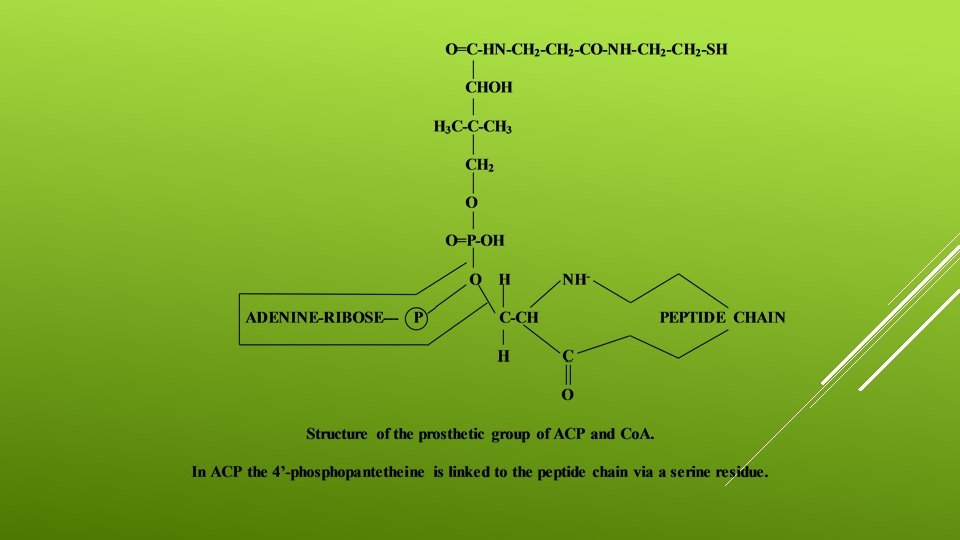 BIOSYNTHESIS OF SATURATED FATTY ACIDS Introduction v It was belied for long that fatty biosynthesis was the reversal of the pathway of fatty acid degradation. v However, several major points of difference between the degradation and biosynthesis of fatty acids are known. Biosynthesis v (i) Co. A- derivatives do not act as the substrates of the enzymes in fatty acid synthesis but instead acyl moieties are connected to an acyl carrier protein (ACP). v ACP has a molecular weight of 10, 000. v Its prosthetic group is 4 -phosphopantheine and it thus resembles coenzymes.