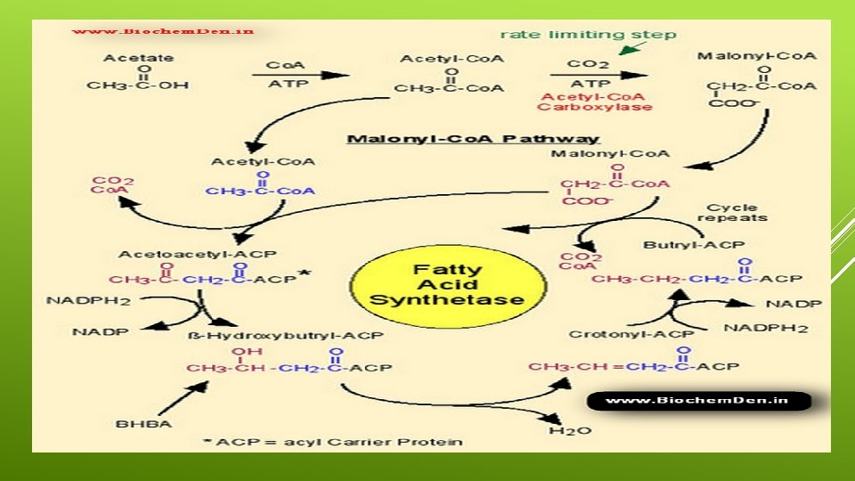 v The formation of malonyl-Co. A has been catalyzed by the biotin containing enzyme called acetyl-Co-A carboxylase. v In some microorganisms, malonyl-Co. A can be formed by reactions other than carboxylation of acetyl Co. A. v These reactions are as follows: v (i) Activation of malonate by the specific malonyl-Co. A sythetase in the presence of ATP and Co. A. Malonate + Co. ASH + ATP v malonyl –Co. A+ADP+Pi (ii) Co. A transferase reaction between malonate and succinyl-Co. A or acetoacetyl-Co. A. R – CO – SCo. A + malonate malonyl – Co. A + RCOOH and v (iii) Oxidation of malonyl - semi aldehyde to malonyl Co. A. v An attempt was made to study fatty acid sythesising systems from a number of resources such as E. coli, yeast and pigeon liver.