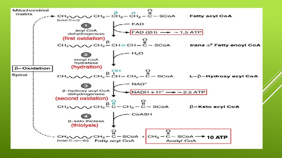 v The beta-oxidation of palmitic acid is illustrated. v Beta-oxidation of fats is a good source of energy production. v In each cycle of beta-oxidation, there occurs the formation of 5 ATP molecules (3 from the oxidation of NADH and 2 from FADH 2). v One ATP gets used up in the reaction. In this way 35 -1=34 ATP molecules are formed in 7 turns of palmitic acid oxidation. v Besides this, 8 acyl Co. A produced from palmitic acid will yield 12 x 8=96 ATP molecules. v This will give a total of 130(96+34) ATP per palmitic acid molecules.