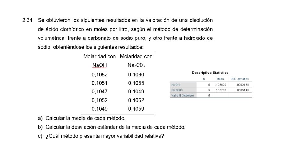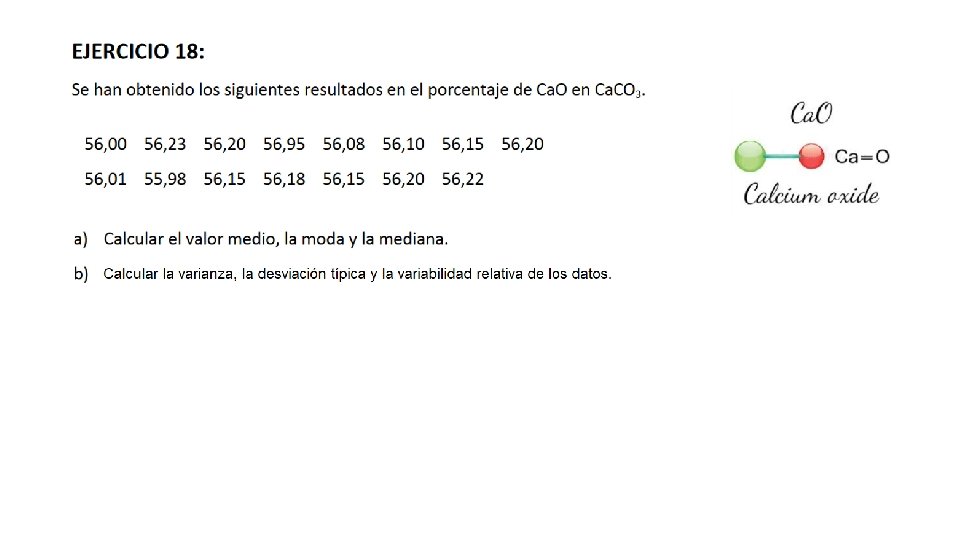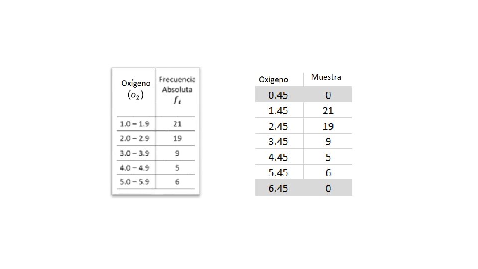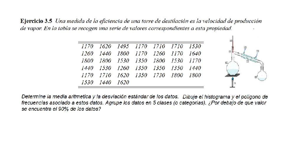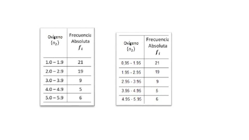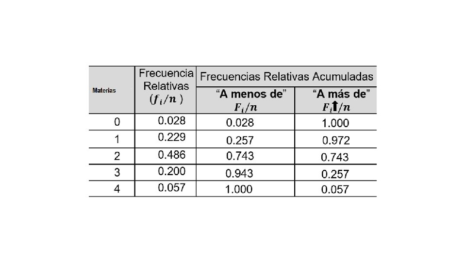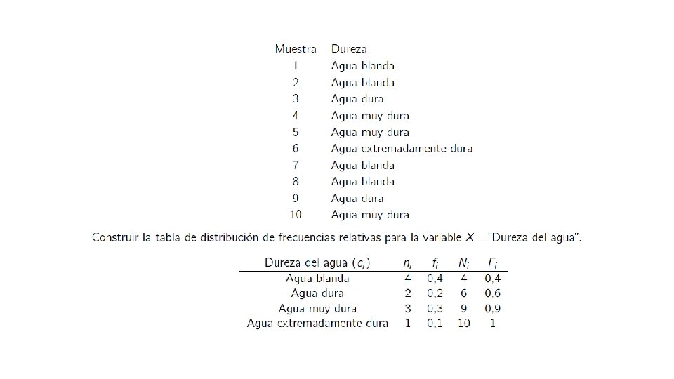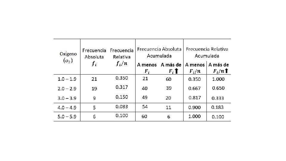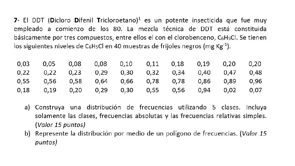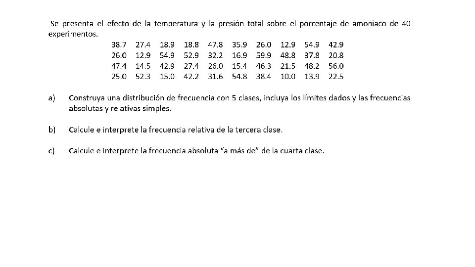 Ejemplo: 1. 1 2. 3 1. 6 3. 2 1. 2 4. 5 1. 1 1. 3 4. 7 1. 9 2. 6 3. 8 1. 1 4. 6 1. 3 2. 8 2. 3 1. 1 2. 2 3. 3 2. 1 1. 8 4. 2 2. 4 1. 8 5. 0 2. 5 5. 8 3. 9 2. 6 3. 6 1. 0 2. 3 1. 8 5. 4 2. 6 2. 8 2. 4 1. 1 1. 8 4. 5 1. 4 1. 1 2. 7 2. 3 5. 9 1. 1 3. 8 5. 2 2. 8 3. 1 3. 8 1. 7 1. 2 2. 7 1. 5 5. 6 Construya una distribución de frecuencias con cinco clases (incluya los limites indicados y las frecuencias absolutas y relativas).
