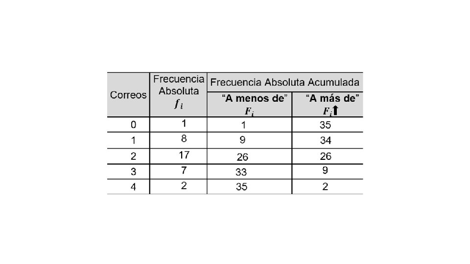 Frecuencias de Variables Discretas Ejempl. Números de correos electrónicos que tienen una muestra aleatoria de 35 estudiantes de la Universidad de Costa Rica.