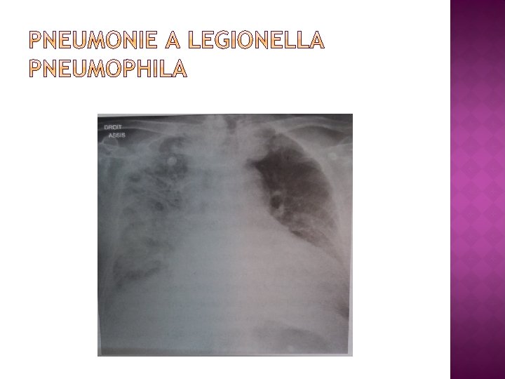 � Infections acquises an ville � Absence de documentation microbio 50% � Strepto pneumoniae +++ � Ensuite : virus , bactéries intracellulaires (legionella pneumophila, mycoplasma pneumoniae, chlamydophila pneumoniae) et BGN � Strepto pneumoniae et legionella pneumophila formes sévères +++