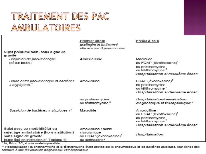 � Repos au lit � Arrêt de travail � Arrêt définitif de tabac �Réévaluation à 48 -72 h �Rx Thorac F/P 2 mois après guérison clinique �Durée de TTT 7 à 10 jours � Vaccination anti pneumo et antigrippal pour les sujets à risque