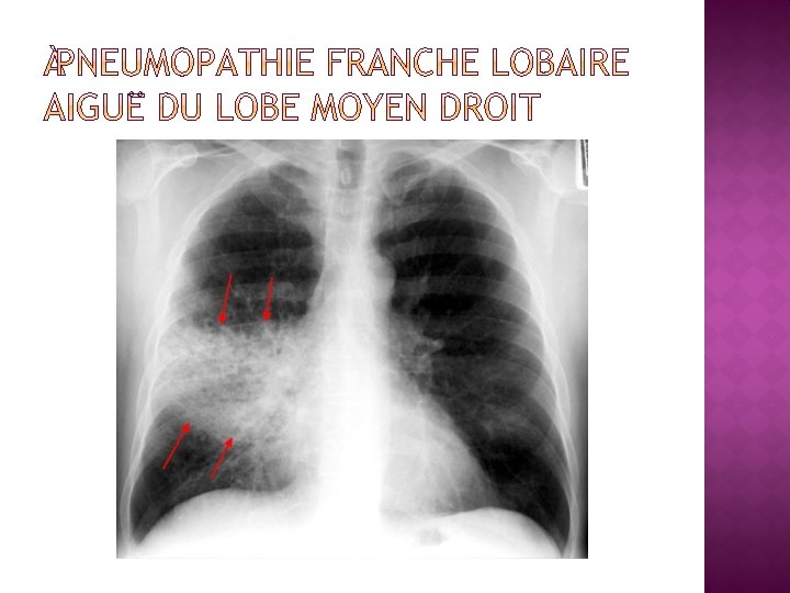 � Signes fonctionnels : toux+ expectoration parfois purulente voire hemoptoique+ douleur thoracique+ dyspnée � Signes physiques : Sd de condensation (vibrations vocales , matité, râles crépitant, souffle tubaire) ou simples râles bronchiques � Signes infectieux : fièvre+frissons+malaise général � Distinction entre pneumonie alvéolaire et pneumonie interstitielle +++