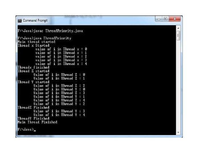 class Z extends Thread { public void run() { System. out. println("Thread Z started"); for(int i=0; i<5; i++) { System. out. println("t. Value of i in Thread Z : " + i); } System. out. println("Thread. Z Finished"); } } class Thread. Priority { public static void main(String[] args) { System. out. println("Main thread started"); X thread. X = new X(); Y thread. Y = new Y (); Z thread. Z = new Z ();