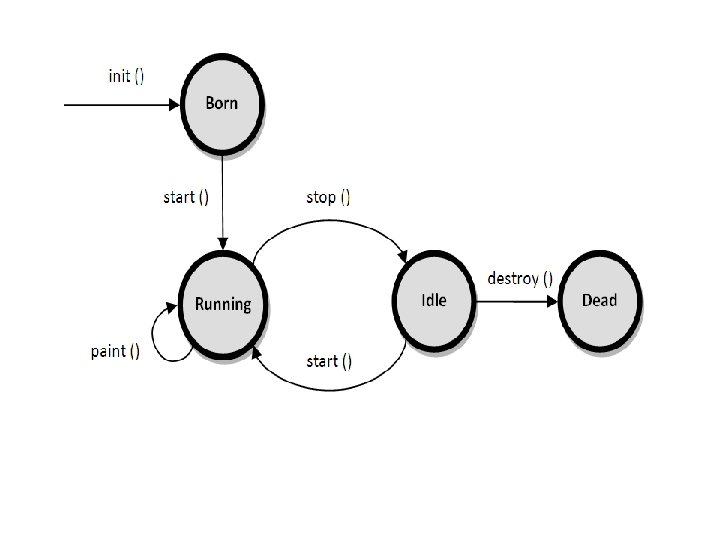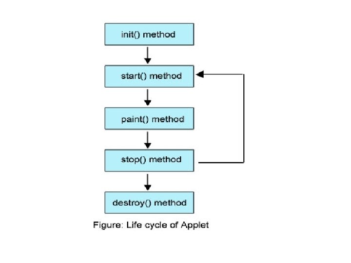 Lifecycle methods for Applet: The java. applet. Applet class 4 life cycle methods and java. awt. Component class provides 1 life cycle methods for an applet. java. applet. Applet class For creating any applet java. applet. Applet class must be inherited. It provides 4 life cycle methods of applet. public void init(): is used to initialized the Applet. It is invoked only once. public void start(): is invoked after the init() method or browser is maximized. It is used to start the Applet. public void stop(): is used to stop the Applet. It is invoked when Applet is stop or browser is minimized. public void destroy(): is used to destroy the Applet. It is invoked only once.