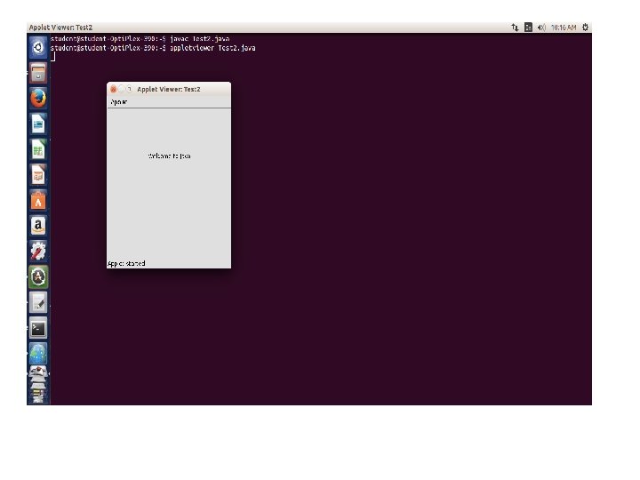 Note: class must be public because its object is created by Java Plugin software that resides on the browser. import java. applet. Applet; import java. awt. Graphics; public class First extends Applet { public void paint(Graphics g){ g. draw. String("welcome", 150); } } c: >javac First. java c: >appletviewer First. java