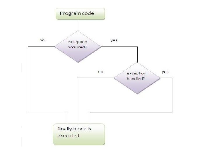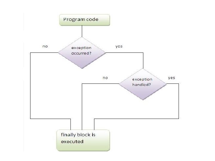 finally Ø finally creates a block of code that will be executed after a try /catch block has completed and before the code following the try/catch block. The finally block will execute whether or not an exception is thrown. If an exception is thrown, the finally block will execute even if no catch statement matches the exception. Ø Any time a method is about to return to the caller from inside a try/catch block, via an uncaught exception or an explicit return statement, the finally clause is also executed just before the method returns. Ø This can be useful for closing file handles and freeing up any other resources that might have been allocated at the beginning of a method with the intent of disposing of them before returning. Ø The finally clause is optional. However, each try statement requires at least one catch or a finally clause. Ø For e. g.