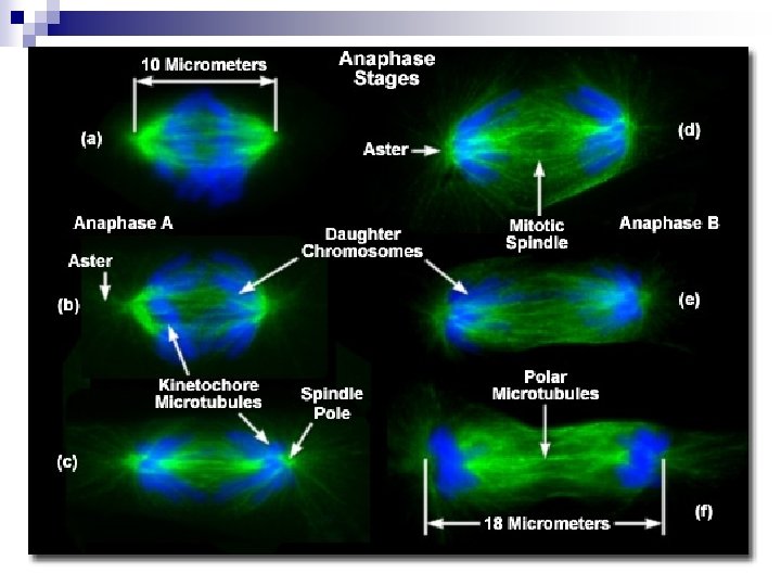 Tahap-tahap anafase n Anafase terbagi menjadi dua proses, yaitu : ¨ Anaphase A (anafase awal) : Pasangan kromosom pada keping metafase terpisah dan kromatid bergerak menuju spindle poles pada sisi sel yang berlawanan karena terjadi pemendekan mikrotubul kinetochore. ¨ Anaphase B (anafase akhir) : Saat kromosom sudah bermigrasi ke spindle pole, mikrotubul kinetochore mulai menghilang sementara mikrotubul polar terus memanjang untuk pemisahan lebih lanjut spindel pole.