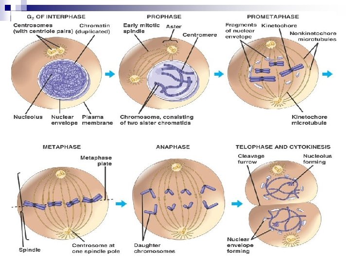 1. Profase : Kromatin dalam nukleus mulai terkondensasi dan terlihat sebagai kromosom. n Nukleolus menghilang n Sentrosom mulai bergerak ke ujung nukleus yang berlawanan dan suatu benang mikrotubula mulai memanjang pada sentromer untuk membentuk benang mitosis (mitotic spindle) n
