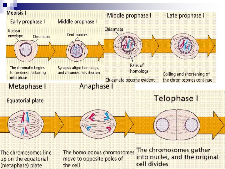 Tahapan pembelahan meiosis 1 sebagai berikut: a. Profase 1 Fase ini melalui beberapa tahap 1. Leptoten: benang-benang kromatin memendek dan menebal serta mudah menyerap zat warna (pembentukan kromosom) 2. Zigoten: sentrosom membelah menjadi 2. tiap belahan bergerak kearah kutub yang berlawanan, sementara kromosom yang homolog saling berpasangan (sinapsis)