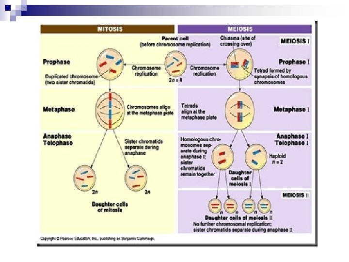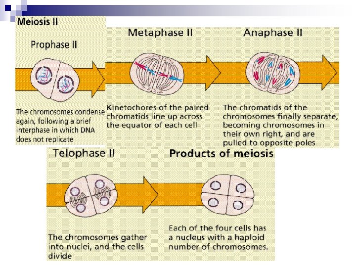 n n n Baik pada pembelahan meiosis I dan II, terjadi fase pembelahan seperti pada mitosis. Oleh karena itu dikenal adanya profase I, metafase I, anafase I , telofase I, profase II, metafase II, anafase II, dan telofase II. Akibat adanya dua kali proses pembelahan sel, maka pada meiosis, satu sel induk akan menghasilkan empat sel baru, dengan masing sel mengandung jumlah kromosom setengah dari jumlah kromosom sel induk.