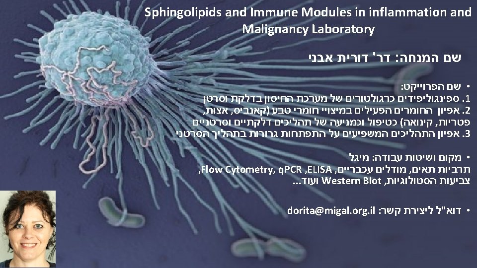 Dr. Dorit Avni- in vitro and pre clinical models My lab focuses on 3 major research aims: 1. Role of sphingolipids in health and disease- # Sphingolipids and Immune Modules in inflammation and Malignancy # Sphingolipids as a link between obesity, chronic inflammation and cancer 2. Natural compounds as immune regulators#The use of nutritional and natural compounds (algae, mushrooms and cannabis) as prevention or treatment for human disease and the regulation of the immune system 3. Discovering the pathways involved in metastasis formation Collaborations (International and national): 1. Prof. Soliman Khatib- MIGAL, Israel 2. Prof. Dan Levanon, Dr. Ofer Danay, Dr. Idan Perman- MIGAL, Israel 3. Prof. Eran Perlson- Tel-Aviv University, Israel 4. Meir and RAMBAM hospitals, Israel 5. Yemoja, LTD- Israel 6. Dr. Maria Hayes– Teagasc, Ireland 7. Dr. Pavel Hrouzek - Center Algatech, the Czech Republic