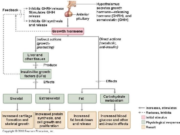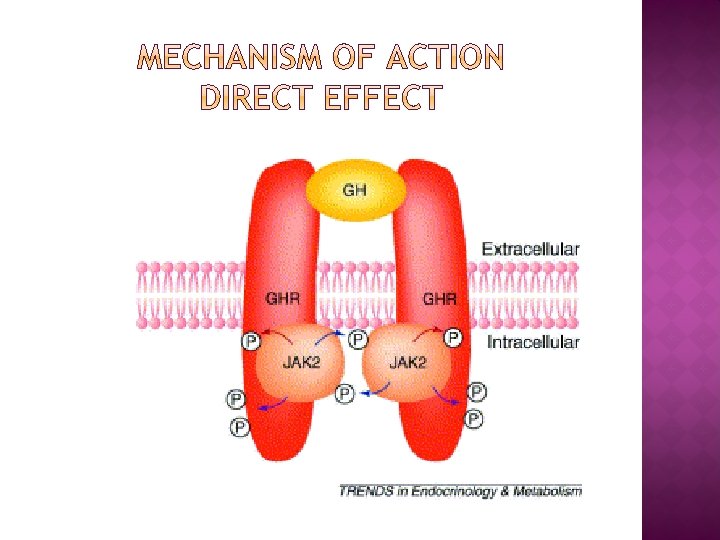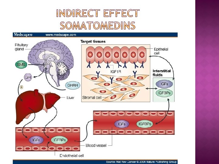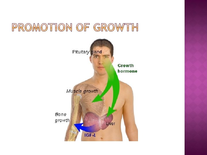 A) § § Long term effect Promotion of growth: cellular sizes & mitosis tissue growth & organ size Indirect effect Depends on somatomedin ‘insulin– like growth factor [IGF-I& II] secreted by the liver, which is responsible for effect of GH on bone & cartilage growth and increase the synthesis of protein in skeletal muscles.