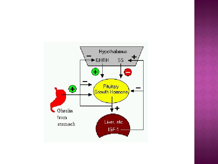 1. The hypothalamus: a. GHRH GH secretion. b. GHIH (somatostatin) GH secretion 2. Hypoglycemia (fasting) GH secretion. (N. B. glucose intake GH secretion). 3. FFAs GH secretion