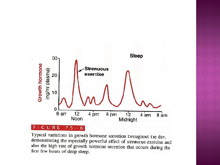 4. Intake of protein or amino acids GH secretion (after meals). 5. Starvation & protein deficiency GH 6. During sleep more in children. 7. Stress conditions, e. g. trauma or emotions GH secretion. 8. Ghrelin (stomach) GH secretion. 9. Muscular exercise GH secretion.