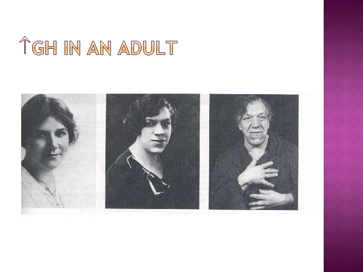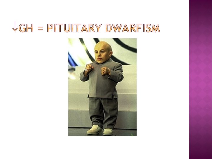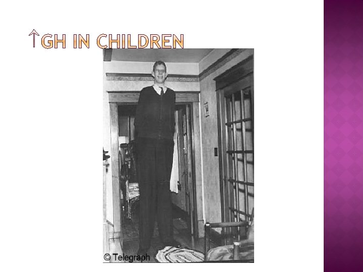 ABNORMALITIES OF GH SECRETION: Signs & symptoms ‘in childhood’: Gigantism, � � as all body tissues grow rapidly, including bones. Height as it occurs before epiphyseal fusion of long bones with their shafts. Hyperglycemia (diabetes). � Signs & symptoms ‘in adults’: Acromegally, person can’t grow taller, BUT soft tissue continue to grow in thickness (skin, tongue, liver, kidney, …) - Enlargement of bones of hands & feet. - Enlargement of membranous bones including cranium, nose, forehead bones, supraorbital ridges. - Protrusion of lower jaw. - Hunched back (kyphosis) (enlargement of vertebrae).