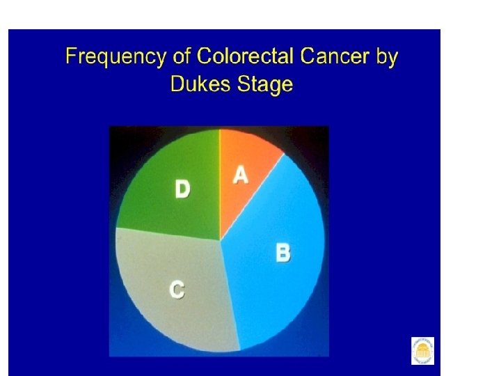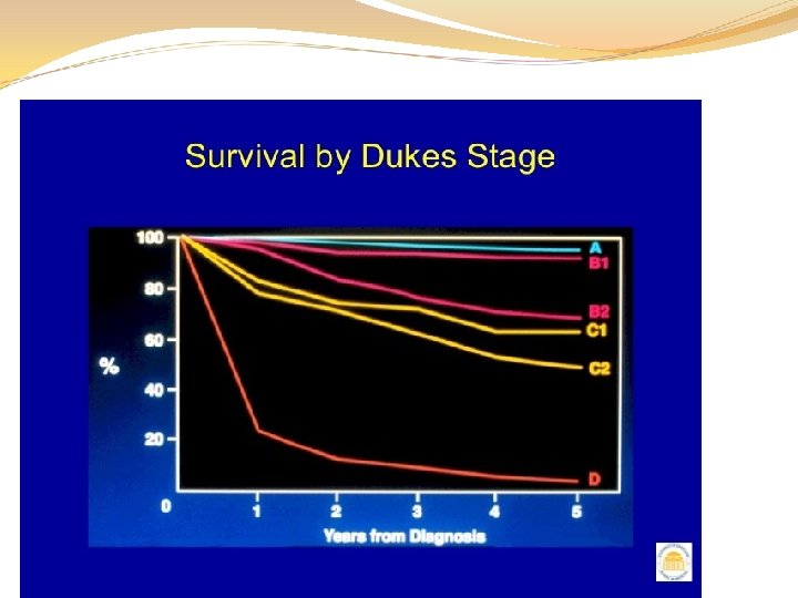 Staging of Colorectal Cancer Stage Extent of tumor 5 -year survival Mucosa Muscularis mucosa Submucosa Muscularis propria Serosa Fat Lymph nodes C 2 C 1 A Not throug Through No deeper B 1 B 2 D bowel wall: than lymph Not Through lymph Distant submucos node through bowel wall node metastases > 90 A bowel wall 70– 75% metastases < 5% % 25– 45% 80– 85% 50– 65%