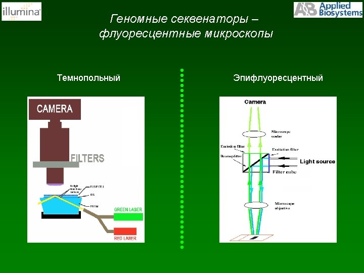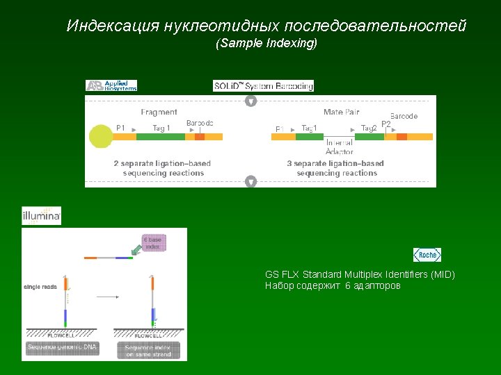 SBS / SBL (sequencing by synthesis / sequencing by ligation) Полимеразный синтез ДНК Лигазный синтез ДНК A new class of cleavable fluorescent nucleotides: synthesis and optimization as reversible terminators for DNA sequencing by synthesis / Turcatti G. , Romieu A. , Fedurco M. , Tairi A. -P. // Nucleic Acids Research, 2008, Vol. 36, No. 4 e 25. 5’ 3’ 3’ 5’