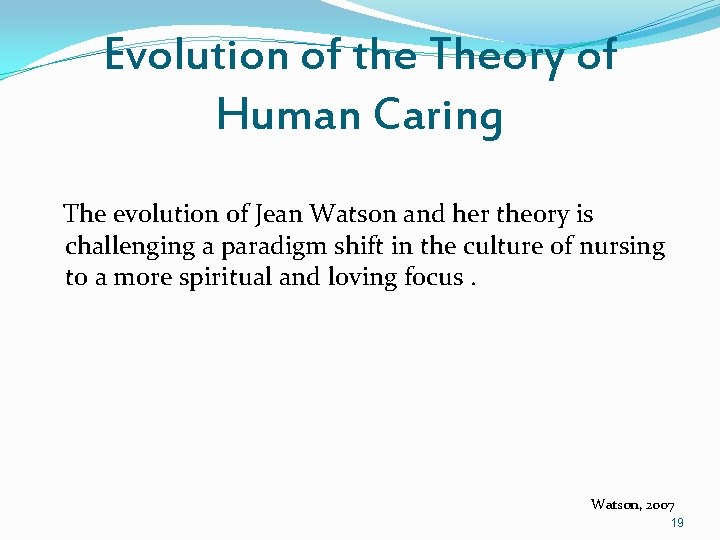 Evolution of the Theory of Human Caring The evolution of Jean Watson and her theory is challenging a paradigm shift in the culture of nursing to a more spiritual and loving focus. Watson, 2007 19