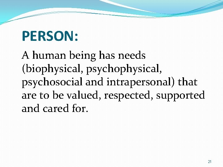 PERSON: A human being has needs (biophysical, psychophysical, psychosocial and intrapersonal) that are to be valued, respected, supported and cared for. 21