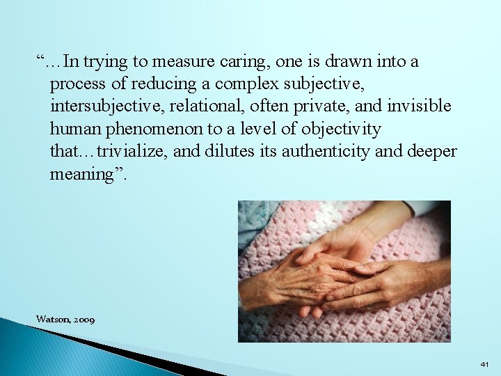 “…In trying to measure caring, one is drawn into a process of reducing a complex subjective, intersubjective, relational, often private, and invisible human phenomenon to a level of objectivity that…trivialize, and dilutes its authenticity and deeper meaning”. Watson, 2009 41