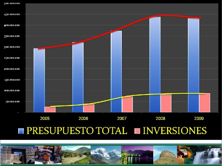 EVOLUCION DE LAS INVERSIONES Y EJECUCION 2005 - 2007 AÑO PIA PIM EJECUTADO % 24. 879. 689 99% 2005 23. 705. 908 25. 110. 116 2006 28. 701. 667 38. 720. 806 28. 328. 758 73% 2007 32. 110. 739 72. 520. 616 62. 807. 085 87% 2008 81. 826. 382 81. 215. 223 68. 428. 122 84% 2009 74. 224. 710 86. 589. 434 36. 461. 738 42% TOTAL 240. 569. 406 304. 156. 195 220. 905. 392 77% FUENTE: MEF-Portal de Transparencia Económica