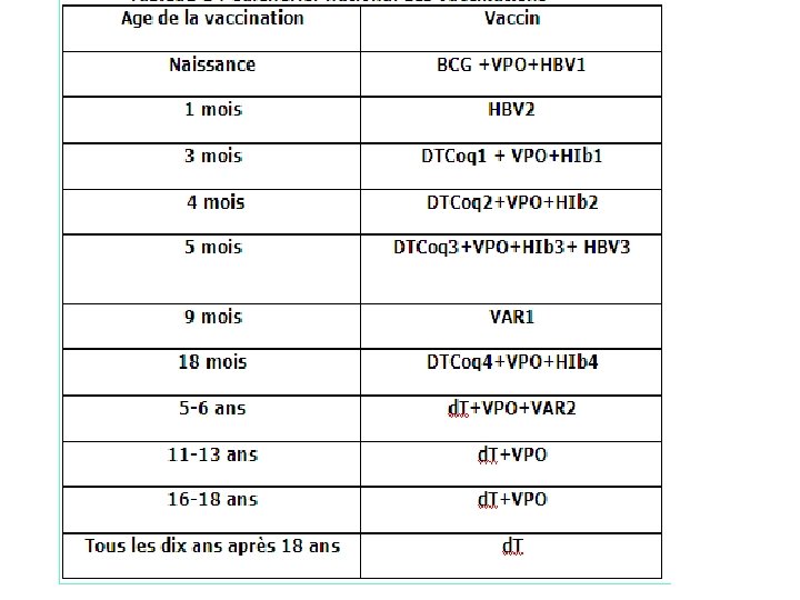 NOUVEAU CALENDRIER VACCINAL AGES VACCINS Naissance BCG + VPO + HBV 02 mois Pentavalent ( DTCHib + HBV) + VPO+ Pneumo 03 mois IPV 04 mois Pentavalent ( DTCHib + HBV) + VPO + Pneumo 11 mois ROR 12 mois Pentavalent ( DTCHib + HBV) + VPO+ Pneumo 18 mois ROR 06 ans DTC (enfant) + VPO 11 ans – 13 ans d. T (adulte) + VPO 16 ans – 18 ans d. T (adulte) Tous les 10 ans d. T (adulte)