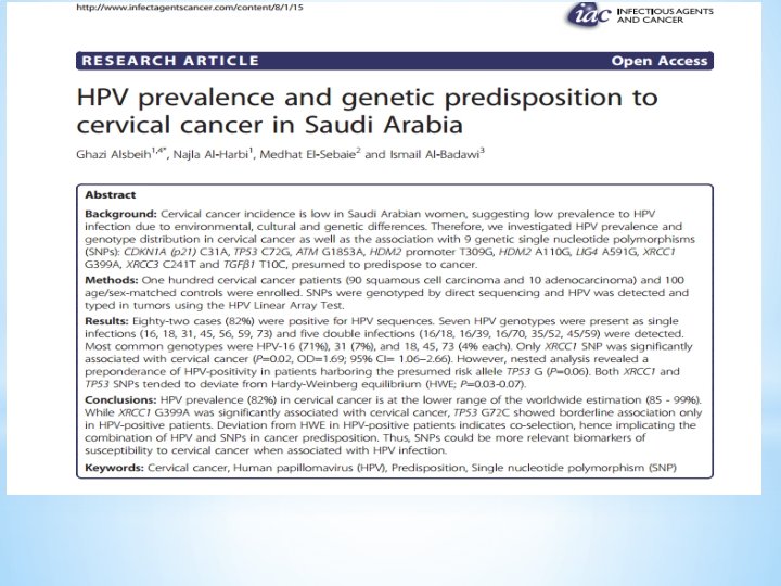 Conclusions ØThe prevalence of HPV infection in invasive cervical cancer in Saudi Arabia (82%) is at the lower range of that observed in the world (85%-99%) Øthe most common HPV genotype was HPV-16 (71%), followed by HPV-31 (7%), HPV-18, 45, and 73 (4% each) Ø double infections were present in 8. 5% of HPV-positive patients.