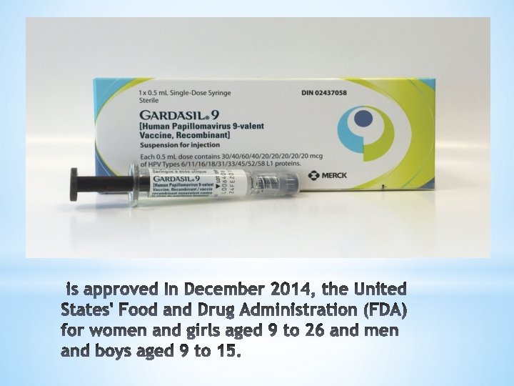 üa quadri-valent HPV vaccine, targets HPV types 6, 11, 16, and 18 üIt is approved for the prevention of cervical cancer and cervical and vulvar intra epithelial neoplasia in young women üapproved for both men and women from the ages of 9 to 26 for the prevention of genital warts, anal cancers, and anal intraepithelial neoplasias.