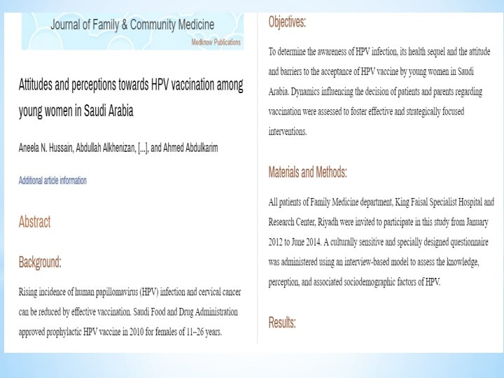 v. The Departments of Obstetrics and Gynecology, and Histopathology at KKUH conducted A retrospective study. vreviewed all cervical pap smears obtained from Saudi women between the years of 2004 and 2014. v found that the frequency of epithelial cell abnormalities in the cervix among Saudi women is relatively low. v. The mean age of cervical carcinoma was 61 years, which is higher than the one reported in western countries. vrelatively high incidence of invasive Cancer, which is found in older Saudi women, suggest that the starting age of cervical screening in our society should be from 25 years with continuation of the screening till after 65 years of age.