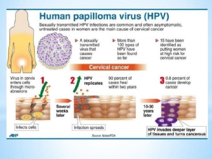 DISEASE ASSOCIATIONS: v. HPV-related disease in females Ø Cervical cancer and precursor lesions -is the third most common female cancer worldwide -IN U. S -THE ESTIMATED ANNUAL INCIDENCE OF CIN AMONG FEMALE WHO UNDERGO CERVICAL CANCER SCREENING IS 0. 4 % FOR CIN 1 AND 0. 5% FOR CIN 2/3 -HPV TYPE 16 AND 18 cause approximatily 70% of cervical cancer and 50 % of precancerous cervical lesions -HPV types 31, 33, 45, 52, and 58 are estimated to cause an additional 19 % of invasive cervical cancers