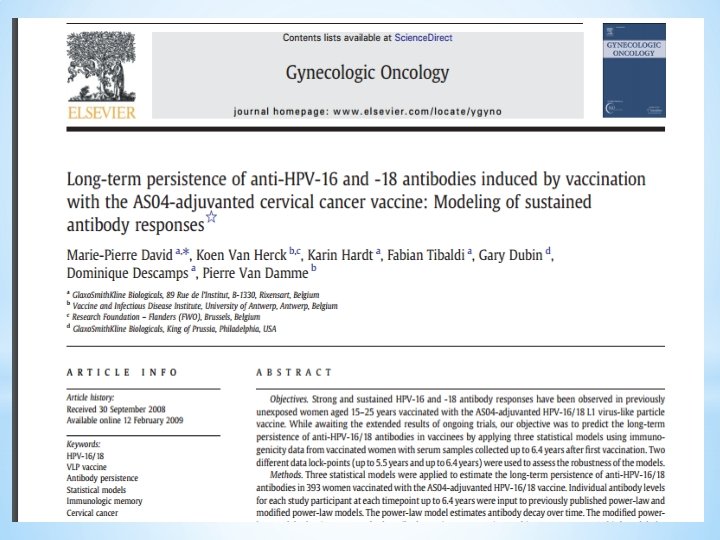 Results: v HPV-16 and -18 antibodies peaked at Month 7 and gradually plateaued at Months 18– 24 and remained stable through 6. 4 years v Mean antibody levels at the last time point were several fold higher than those associated with natural infection. v. The study predict that HPV-16 and -18 mean antibody levels will remain well above those associated with natural infection for at least 20 years