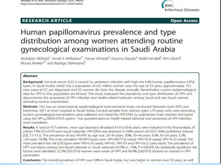 • Result : 1. The overall prevalence of HPV was 9. 8% in Saudi Arabia, but was higher in women over 55 years, as well as in non-Saudi nationals. 2. The most prevalent HR-HPV-types were: HPV-68/73 –--(5 cases) HPV-18 ----(4 cases) HPV-16 (3 cases) The most prevalent low risk types were HPV-6 -- (4 cases) HPV-42, HPV-53 and HPV-54 (2 cases each).