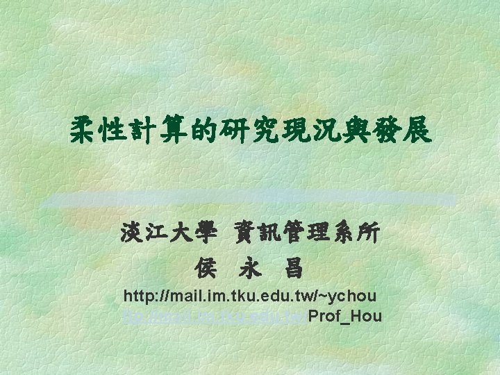 柔性計算 § Dr. Lotfi Zadeh: in 1965 published his seminal work "Fuzzy sets" in the journal Information and Control. § Unfortunately, fuzzy logic did not receive serious notice in this world until the last decade. § The attention currently being paid to fuzzy logic is most likely the result of present popular consumer products employing fuzzy logic. 淡江大學資管所侯永昌 3