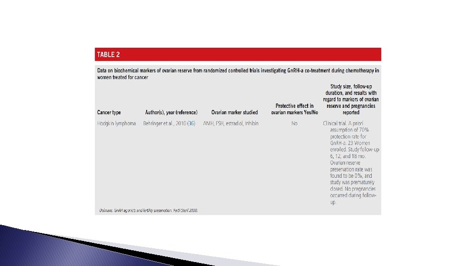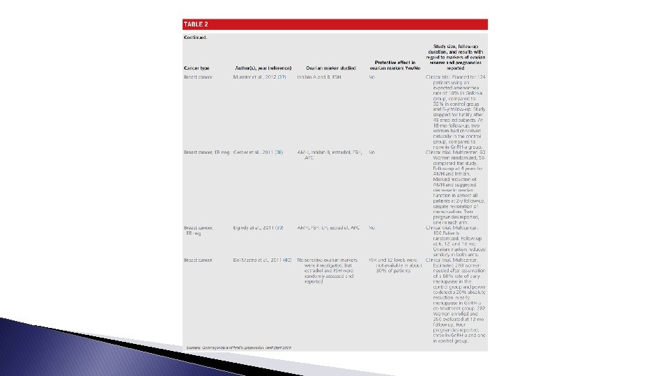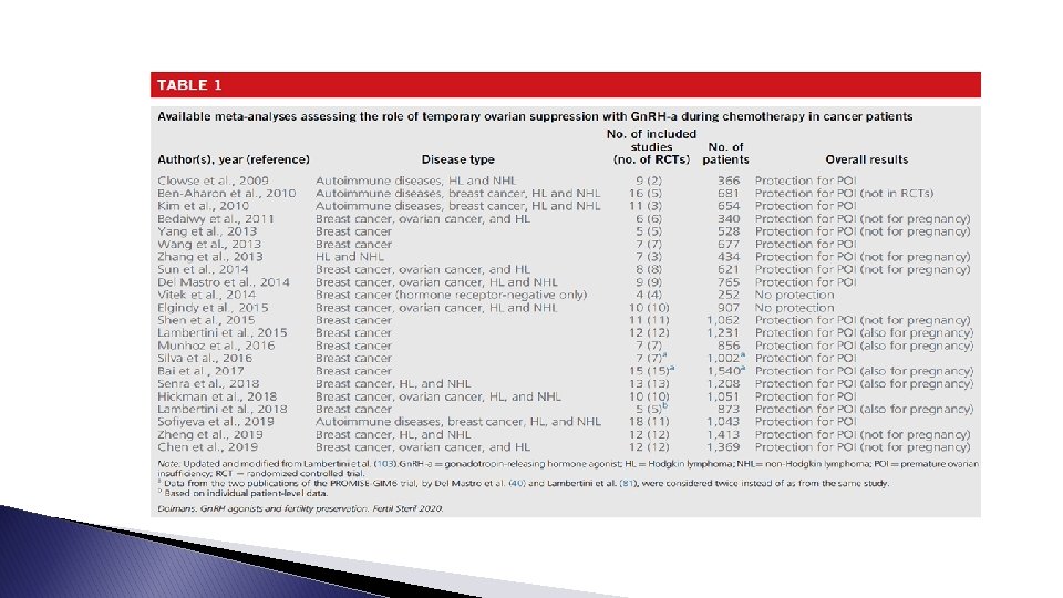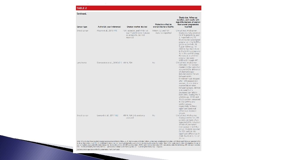 Two main lessons � FIRST : temporary ovarian suppression with Gn. RH-a during chemotherapy should now be considered a standard option for ovarian function preservation in premenopausal breast cancer. : � SECOND data on posttreatment pregnancies remain limited (especially among patients with hormone receptorpositive disease that are candidates to adjuvant endocrine therapy following chemotherapy), use of Gn. RH-a during cytotoxic treatment should not be considered a stand-alone fertility-preserving procedure alternative to cryopreservation options.