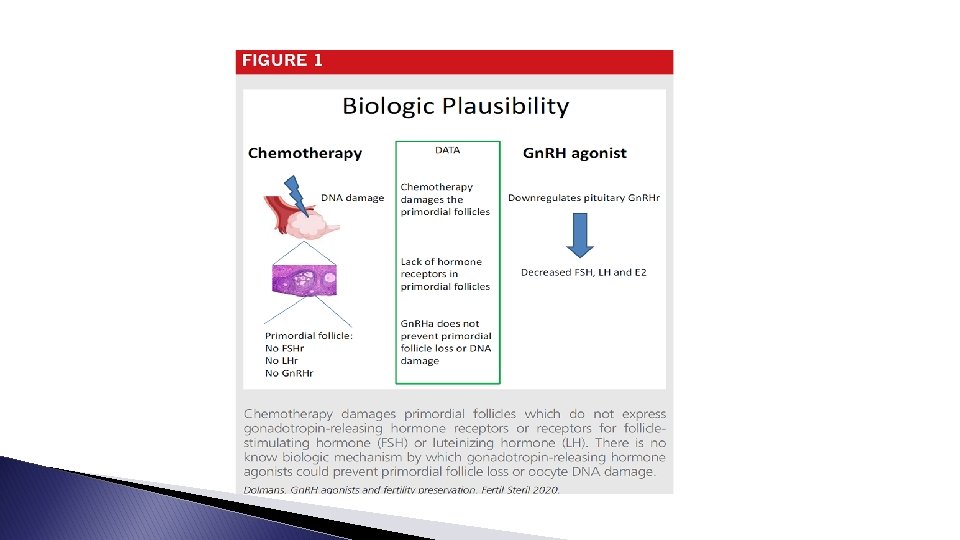 Con 2: Hugh S. Taylor, M. D. Role of gonadotropin-releasing hormone in fertility preservation: lack of biological plausibility � lack of biological plausibility: As PMFs are not recruited by gonadotropins, it is not biologically plausible that use of an agent to suppress gonadotropin production would have an impact on the PMF pool. � Gn. RH-a coadministration did not prevent chemotherapy-induced PMF DNA damage and cell death in a murine model. � it has been hypothesized that Gn. RH-a may still antagonize the cytotoxicity of chemotherapeutics through unknown mechanisms. If true, this effect would not be confined to the ovary and would likely also inhibit the activity of chemotherapy on cancers. Fortunately, Gn. RH-a does not appear to reduce the effectiveness of chemotherapy. There is no evidence that Gn. RH antagonists have a direct effect on PMFs.