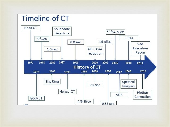 MILESTONES IN CT DEVELOPMENT YEAR EVENTS 1969 G. N. Hounsfield developed first clinically useful CT head scanner 1971 First clinically useful CT head scanner was installed at Atkinson. Morley Hospital (England) 1972 First paper on CT presented to British Institute of Radiology by Hounsfield and Dr. Ambrose 1974 Dr. Ledley introduced the whole body CT scanner (ACTA scanner) 1979 G. N. Hounsfield shared the Nobel Prize with Allan Mac. Leod Cormack
