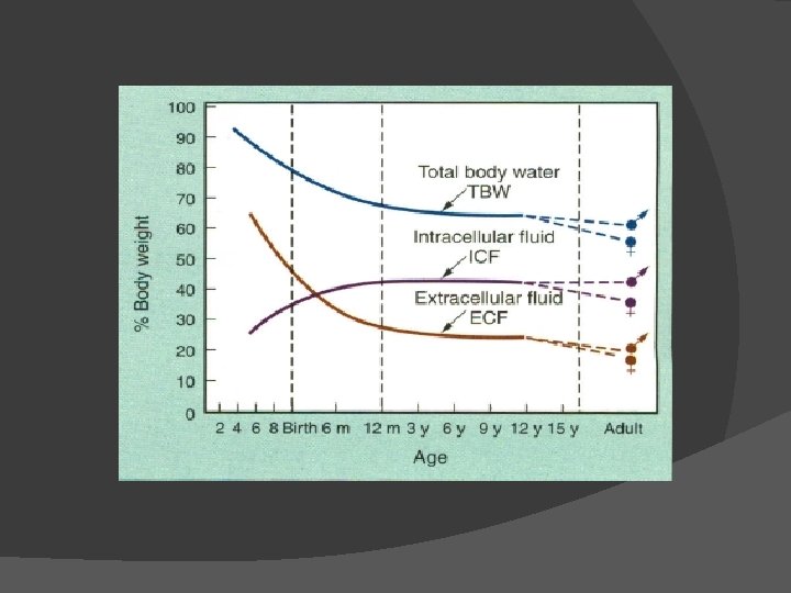 Over the first week of life, water exchange is often negative because of ongoing losses through the skin, lungs, and urine in the setting of limited intake A 7 -kg infant with a 21 OO-m. L ECF volume takes in and excretes approximately 700 to 1000 m. L of fluid daily, which represents a 33% turnover in ECF By comparison, a 70 -kg adult with a 14, 000 -m. L ECF volume excretes approximately 2000 m. L of fluid daily for a 14% turnover This high rate of fluid exchange may expose infants to more rapid development of both dehydration and over hydration