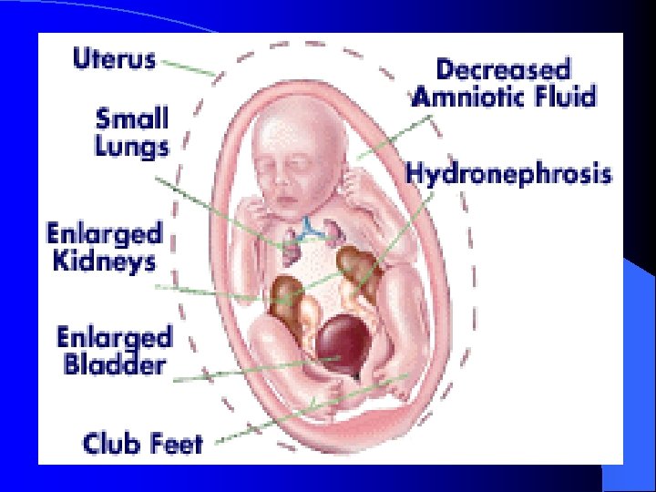 ETIOLOGY l l l l Postdate Fetal Anomalies: obstruction of fetal urinary tract/renal agenesis IUGR ROM Twin/Twin transfusion Exposure to ACE inhibitors, and Non-steroidal anti-inflammatory