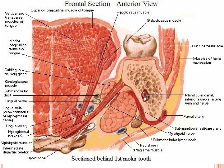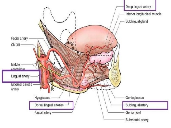 BLOOD SUPPLY Arteries: § Lingual artery § Tonsillar branch of facial artery § Ascending pharyngeal artery Veins: § Lingual vein, ultimately drains into the internal jugular vein Lingual artery & vein Hypoglossal nerve Dorsal lingual artery & vein Deep lingual vein