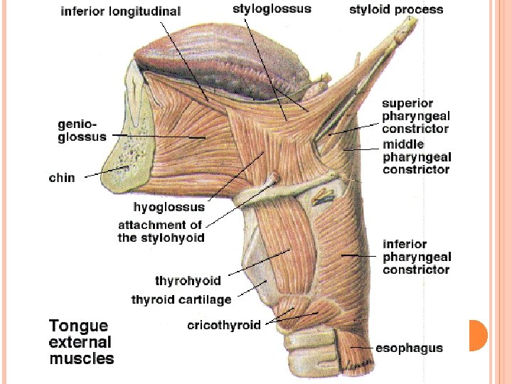 EXTRINSIC MUSCLES Connect the tongue to the surrounding structures: the soft palate and the bones (mandible, hyoid bone, styloid process) Include: Palatoglossus Genioglossus Hyoglossus Styloglossus Function: Help in movements of the tongue