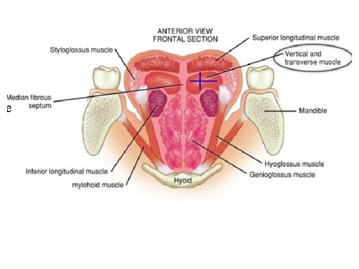 Intrinsic muscles muscle Origion and insertion Action Transverse muscle From the median septum and pass Narrow and lateraly to be inserted into the side elongate the of the tongue. Superior Longitiudinal muscle Attached to the mucus membrane over the posterior part of the tongue and run forward to attaches to the mucus membrane at its edges and tip. Shorting the tongue and turn its tip and edges upwards. Inferior longitudinal fibers Situated lateral to genioglossus in the lower part of the tongue. Shorten the tongue turn its tip and edges downwards. Vertical fibers Run from the dorsum of the tongue to the mucus membrane on its ventral surface. Flatten and broaden the tongue.