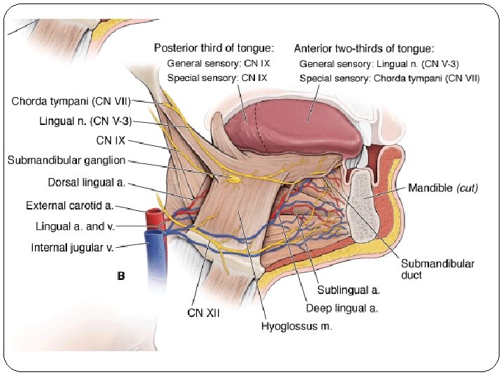 SENSORY NERVE SUPPLY Anterior ⅔: General sensations: Lingual nerve Special sensations : chorda tympani Posterior ⅓: General & special sensations: glossopharyngeal nerve Base: General & special sensations: internal laryngeal nerve